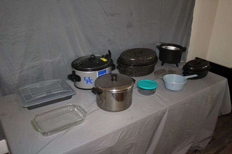 LOT 42 - (2) Granite Ware Roasters, Pressure Cooker, Crock Pot Slow Cooker, Glass Anchor Food Container, Fryer, Strainer, Pyrex Glass Casserole Dish, and Misc.