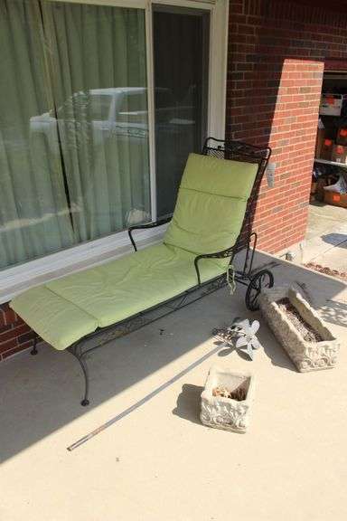 LOT 193 - Wrought Iron Lounge Chair with Cushion, (2) Concrete Flower Pots, and Dog Wind Vane