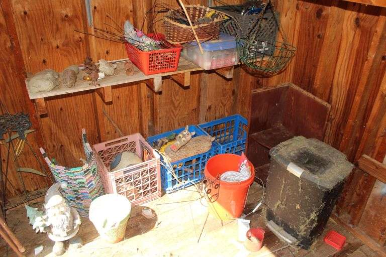 LOT 194 - Wicker Basket, Insulators, Folding Chair, Milk Crates, Metal Basket, Yard Decorations, Trash Can, and Misc.