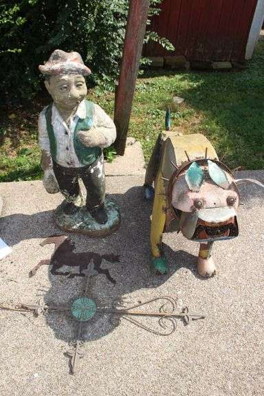 LOT 195 - Concrete Statue, Metal Dog Decoration, and 2-Piece Metal Horse and Cross Decoration
