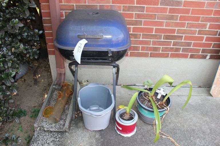 LOT 182 - Charcoal Grill, (2) Flower Pots, and Sterilite Mop Bucket