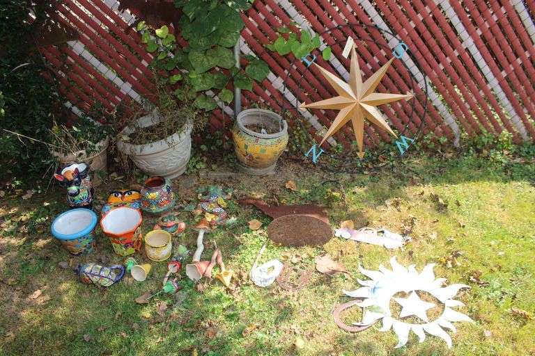 LOT 185 - Flower Pots, Yard Ornaments, Metal Figurines, Compass, and Misc. Yard Decorations