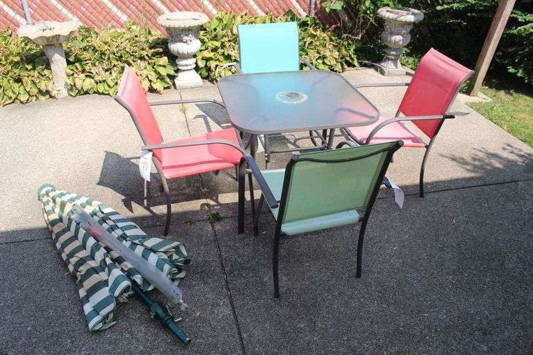 LOT 180 - Glass Top Patio Table, (4) Chairs, and Umbrella