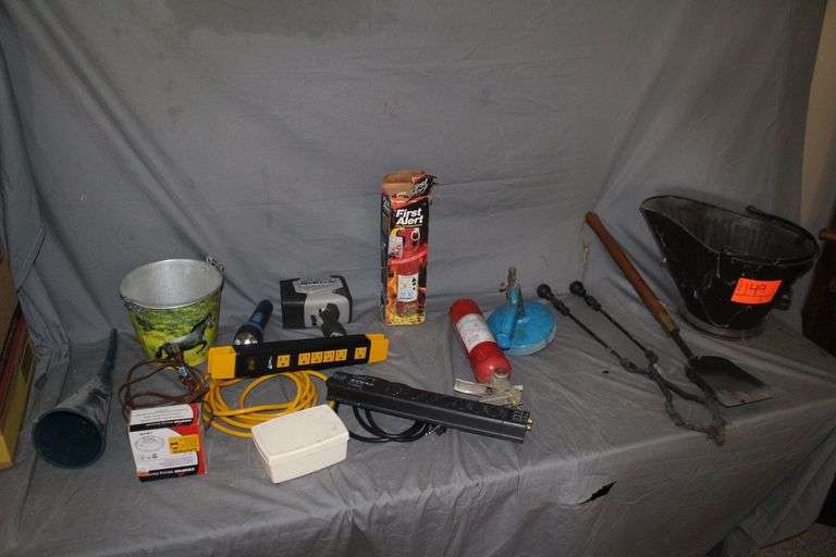 LOT 149 - Ash Bucket, Fireplace Utensils, (2) Fire Extinguishers, Electrical Cords, Funnel, Metal Bucket, Power Strips, Spot Light, and Misc.