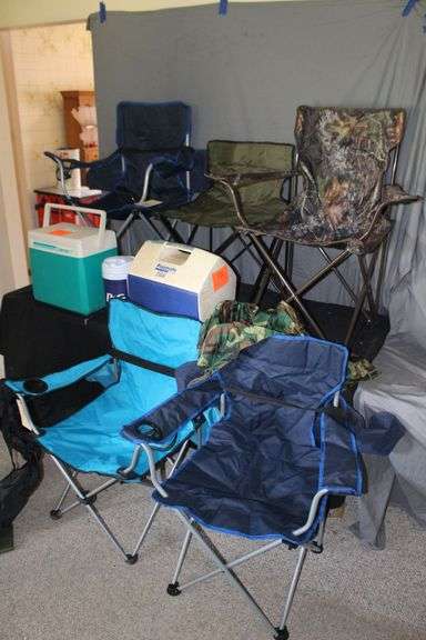 LOT 144 - (5) Bag Lawn Chairs, Coleman and Playmate Cooler, Camo Poncho, and Rubbermaid 1/2 Gallon Water Jug
