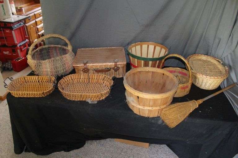LOT 136 - Wicker Baskets, Picnic Basket, Wicker Serving Tray, Broom, and Misc.