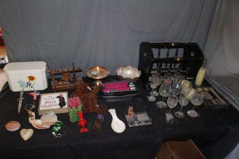LOT 127 - Conair Hair Rollers, Wine Glasses, Pipe Stand, Seashells, Wooden Box, Candles, Glass Vase, Magazine Rack, and Misc.