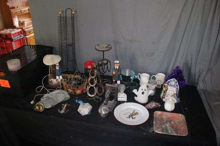 LOT 125 - Horse Shoe Tree, Wooden Sailor Lamp, Wooden Sailor Figurine, Dog Figurines, CD Stand Organizer, Gas Mask, and Misc. Decorations