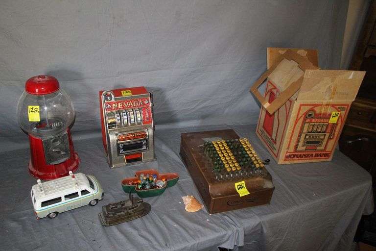 LOT 122 - Las Vegas Nevada Bonanza Bank, Gum Ball Machine, Comptonmeter Cash Register, Bell of Louisville Figure, Marbles, Van Coin Bank, and Candy Dish