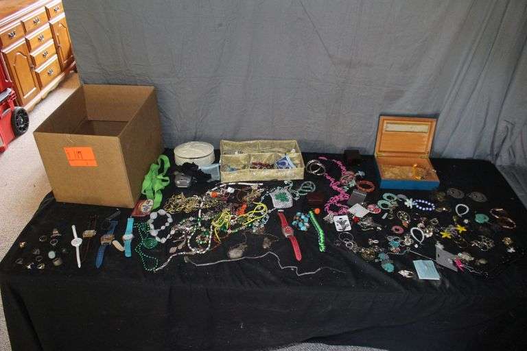 LOT 117 - Red Cloud Jewelry Box, Trinket Box, Bracelets, Necklaces, Watches, and Misc. Costume Jewelry