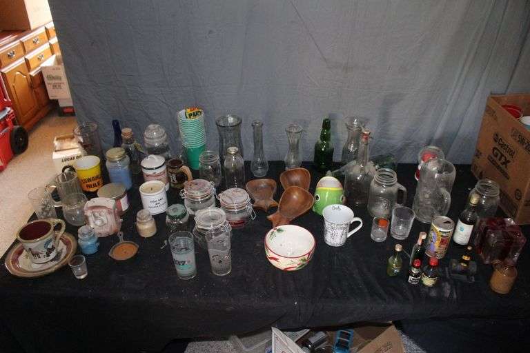 LOT 109 - Glass Beer Mug, Vases, Pineapple Display Dishes, Glass Canisters, Irish Meed Stone Jug, 2011 Derby Glass, and Misc.