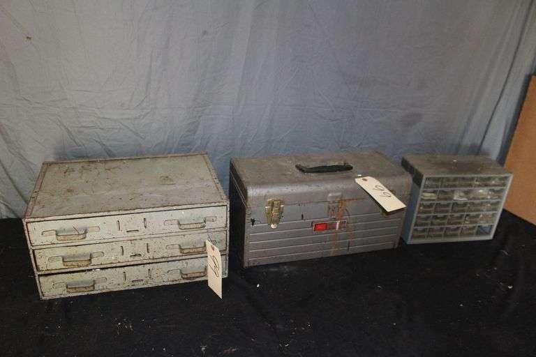 LOT 99 - Craftsman Tool Box, Plastic Bolt Bin and Contents, and 3 Drawer Metal Tool Box with Contents