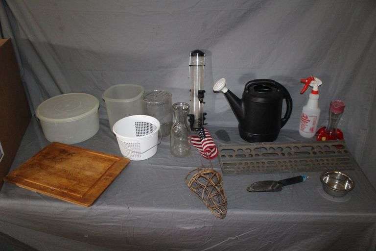 LOT 98 - Wooden Cutting Board, Tool Organizer, Plastic Containers, Bird Feeders, Glass Milk Jar, Watering Can, and Misc.