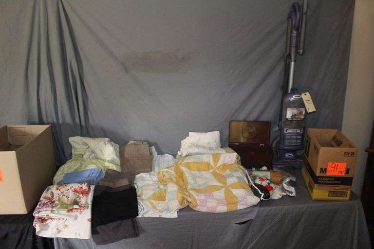 LOT 91 - Shark Vacuum and Attachments, Hand Stitch Quilt, Linens, Thread, Sewing Box, and Misc.