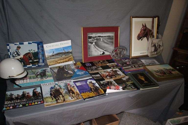 LOT 83 - Churchill Downs Calendars, Horse Racing Posters, Jockey Helmet, Secretariat Framed Picture, Framed Horse Racing Pictures, and Misc.