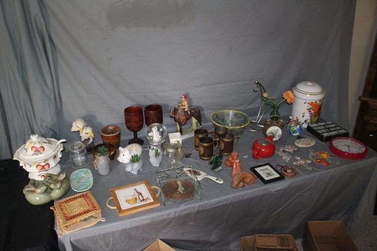 LOT 81 - Cannonade Horse Figurine, Alarm Clocks, Mugs, Wooden Cups, Snow Globe, Canister, Soup Terrine, Glass Bowl, and Misc.
