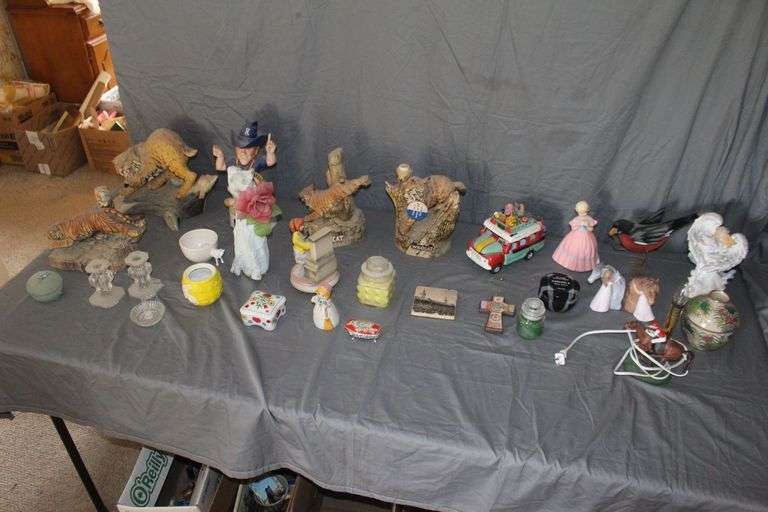 LOT 64 - Kentucky Wildcat Decanters, Horse and Jockey Lamp, Figurines, Trinket Box, Candles, Ring Holder, Candle Stands, and Misc.
