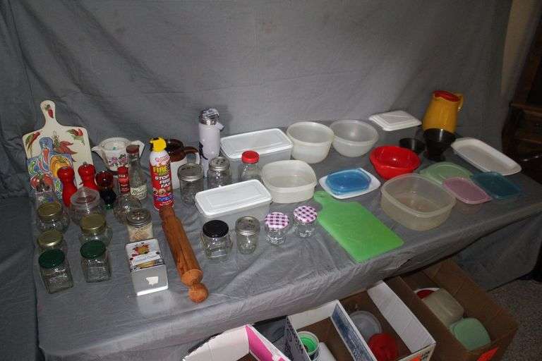 LOT 61 - Pyrex Pitcher, Plastic Food Containers, Glass Jars, Salt and Pepper Grinders, Pin Roller, Stone Pitcher, and Misc.