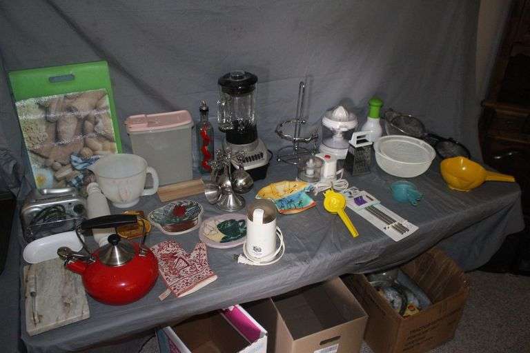 LOT 59 - Black and Decker Blender, Cheese Grater, Stainless Steel Straws, Cutting Boards, Tea Pot, Strainers, Lime Juicer, and Misc.