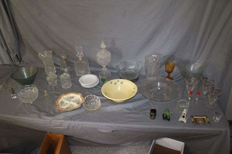 LOT 57 - Lead Glass Vase, Glass Display Bowls, Candy Dishes, Saucers, Decanters, Glass Basket Decoration, Shot Glasses, and Misc.